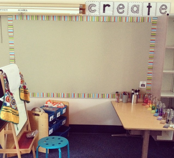 • Make sure you use as many neutral, natural accents as possible. Think brown (yes, brown) bulletin board paper, green or blue table caddies, and borders with little to no design on them.